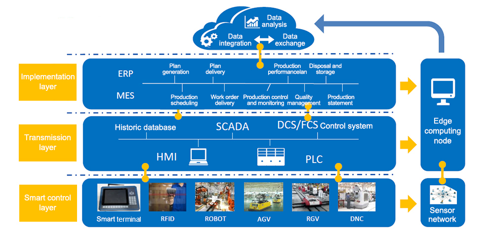 • The smart control layer: smart terminal, RFID, robotic manipulator, AGV, RGV, DNC, etc.